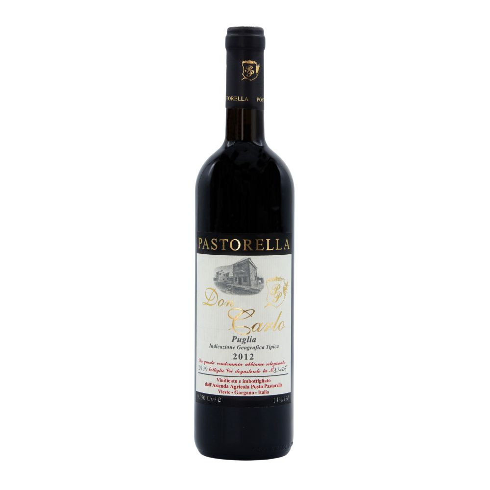 Don Carlo” è un prestigioso vino rosso della denominazione Rosso Puglia I. G. T., annata 2005, con un notevole titolo alcolometrico del 14,08%.